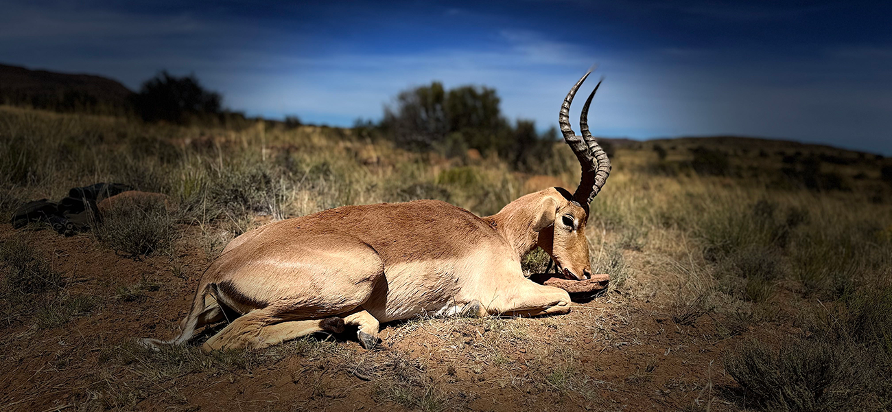 At det er en krævende jagt, fandt vi bestemt ud af, da jeg ønskede af nedlægge en Blesbuch. Vi fandt den i bjergene, men måtte pürsche fra det ene sted til det andet. Ind i bilen og om på den anden side af bjerget igen, pürsche igen op og ned i bjergene, men vi blev snydt gang på gang. Først efter 7 timer lykkedes det at komme på skudhold højt oppe fra, så jeg kunne skyde ned i en vinkel på 45 grader. Jeg fik min Blesbuch.