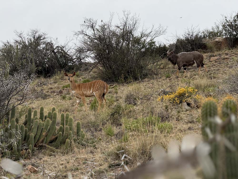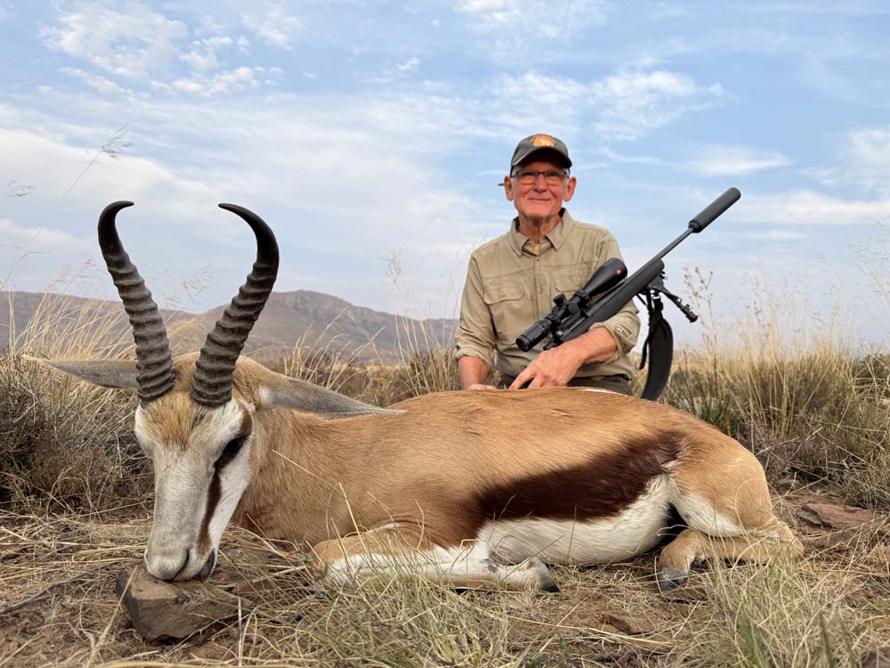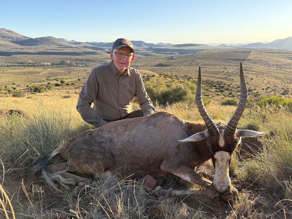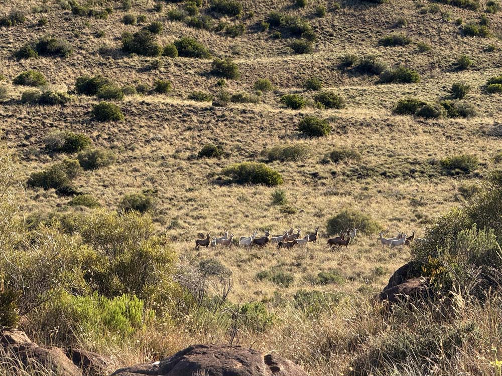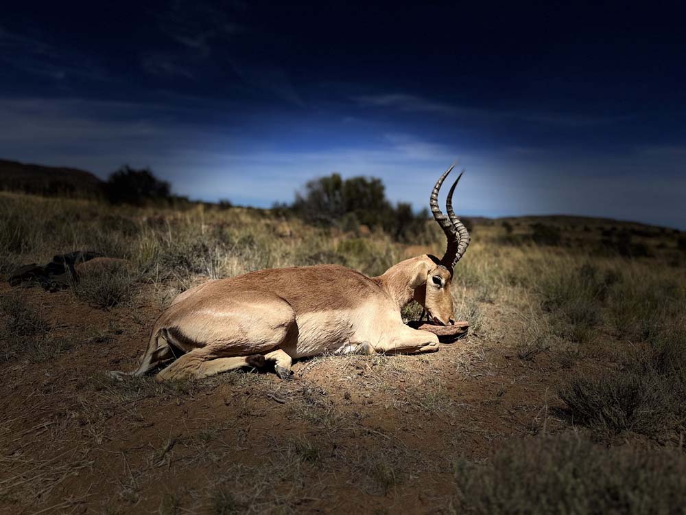 At det er en krævende jagt, fandt vi bestemt ud af, da jeg ønskede af nedlægge en Blesbuch. Vi fandt den i bjergene, men måtte pürsche fra det ene sted til det andet. Ind i bilen og om på den anden side af bjerget igen, pürsche igen op og ned i bjergene, men vi blev snydt gang på gang. Først efter 7 timer lykkedes det at komme på skudhold højt oppe fra, så jeg kunne skyde ned i en vinkel på 45 grader. Jeg fik min Blesbuch.