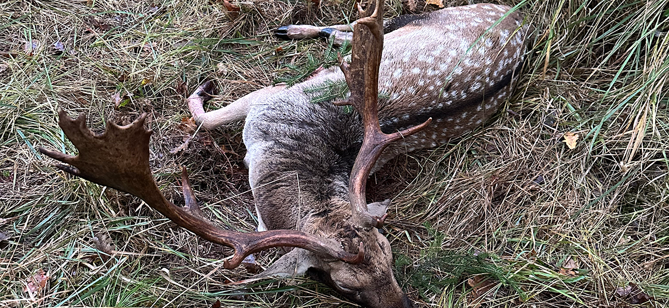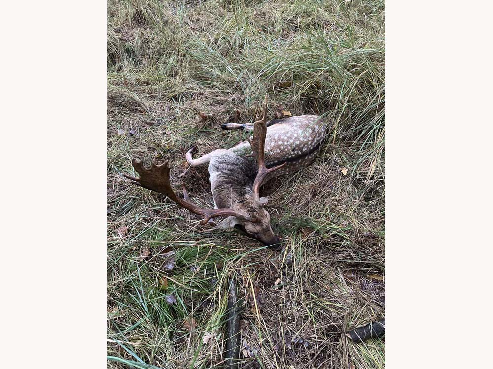 På en brunstplads går der 3 gode hjorte og brøler, og guiden anviser den ene til afskydning. Men hjorte i brunst står ikke meget stille, og da den anviste hjort endelig står rigtigt, så oplever Lars sin første klikker 😱 Da det samtidig er hans første dåhjort, begyndte feberen at tage fat i ham. Han ventede lige de obligatoriske sekunder, før han genladede, og så skulle han lige finde hjorten igen. Men inden han fik tråd korset på hjorten, så kom den store lige ind på pladsen, og de 3 “små” trak til side. Lars var ikke i tvivl om, det var en rigtig god hjort, for det kunne han høre på guidens toneleje: ”schiesen schiesen schiesen”, så det gjorde Lars, med det resultat at hjorten gik mindre end 30 meter, før den faldt omkuld med et gennemskuet hjerte 👍😄 Igen kunne Lars høre på guiden, at det var en god hjort, han havde skudt, og en tilkaldt hjælper, som kom for at hjælpe med at slæbe, kom også med et udbrud: ”ooøøøj”, så endnu en bekræftelse på en god hjort 😄 Til vejningen blev hjorten opvejet til 4,7 kilo 👍😄