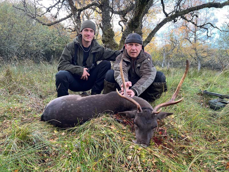 1 Kron & 1 Sikahjort pr. jæger uanset str. efter skyttens anvisning, skotsk ansvarsforsikring samt al transport ifm. m. jagten fra aftalt mødested nær reviret.
